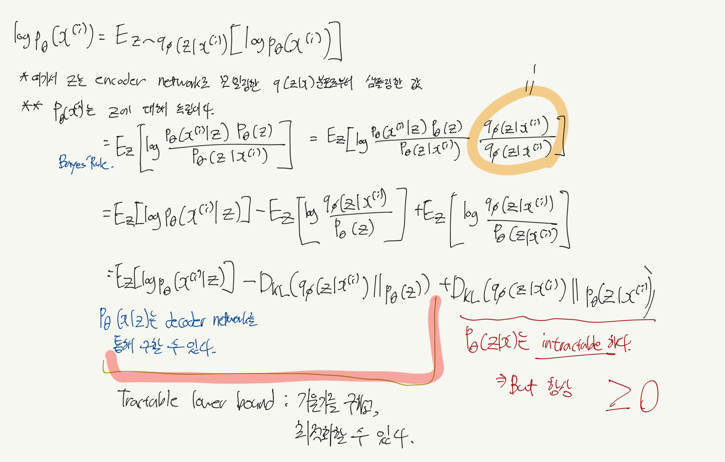 다음 정리를 통해, \(p(z \vert x)\)가 Intractable하므로, 계산할 수 없는 KL부분(우측)을 제외한 Tractable Lower bound를 구할 수 있다.